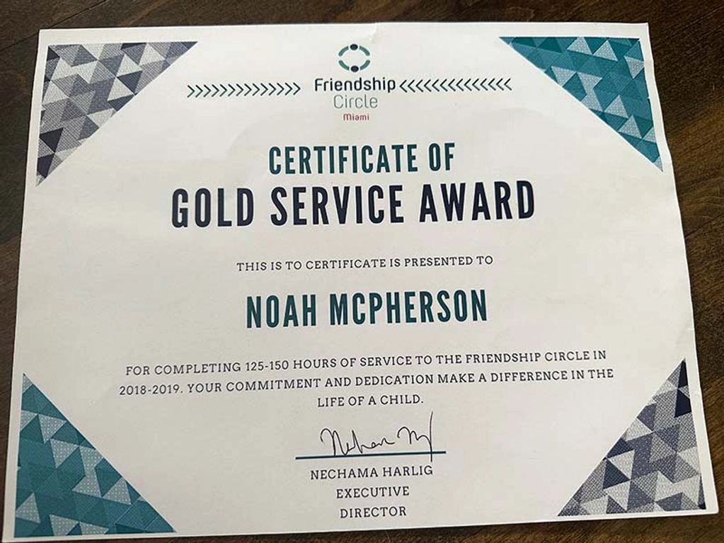 Noah was certified by the Friendship circle for volunteering 150 hours towards helping special needs children and making a difference in the lives of special needs students.